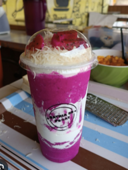 Smoothies dengan bermacam macam buah buahan segar di kemas dengan menarik dengan taburan ptongan buah diatasnya