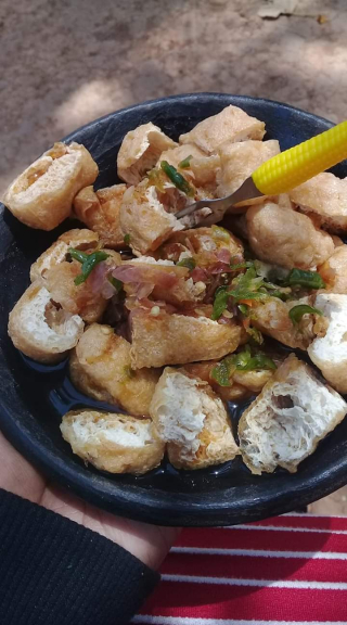 Tahu pong yang di siram kuah gula asam beserta bumbu ulekan bawang merah dan cabe rawit.