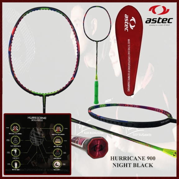 Raket Badminton ORIGINAL ASTEC - ALAN SUSI TECHNOLOGY Type : HURRICANE 900 Color : NIGHT BLACK Spesifikasi : Material : Ballistic 24 Carbon Max Tension : 30 Lbs Weight : 77 +_ 2 Gram Grip Size : G5 Balance : Head Heavy Stiffnes : Very FLEXIBLE Free : Tas kain Cover ORIGINAL ASTEC