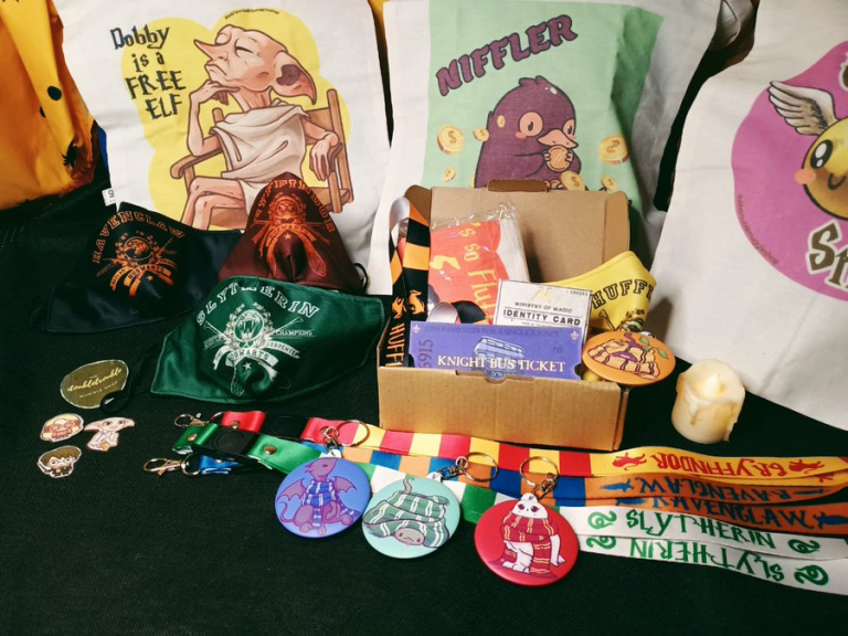 What will you get: ✓ 1 pc totebag (with zipper) ✓ 1 pc reusable fabric mask (2 ply) ✓ 1 pc lanyard ✓ 1 pc keychain ✓ 1 pc knight bus ticket ✓ 1 pc ministry of magic id card (customable) Shopee: doubletroublemuggleshop