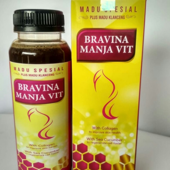 BRAVINA MANJA VIT Adalah ramuan minuman madu yang memadukan antara madu randu dan madu klenceng dengan herbal pilihan : buah manjakani, temu putih, sirih, buah mengkudu dan sembiloto plus kolagen dan gamat. sehingga mengandung berbagai zat-zat aktif yag bermanfaat untuk menjaga kesehatan tubuh, kulit dan mengatasi berbagai problem kewanitaan. Khasiat dan manfaat BRAVIN MANJA VIT : 1. Menjaga elastisitas dan kekencangan kulit 2. Membuat kulit sehtat, cerah dan tidak cepat keriput 3. Membantu mengatasi rematik dan nyeri sendi 4. Membantu mengatasi tulang keropos tulang (osteoposis) ser 5. Membantu mengatasi keputihan, nyeri haid dan haid tidak teratur 6. Mmembantu mengatasi dan mencegah kista, miom, kanker, kanker servick dan kanker payudara. BRAVINA MANJA VIT Adalah ramuan minuman madu yang memadukan antara madu randu dan madu klenceng dengan herbal pilihan : buah manjakani, temu putih, sirih, buah mengkudu dan sembiloto plus kolagen dan gamat. sehingga mengandung berbagai zat-zat aktif yag bermanfaat untuk menjaga kesehatan tubuh, kulit dan mengatasi berbagai problem kewanitaan.