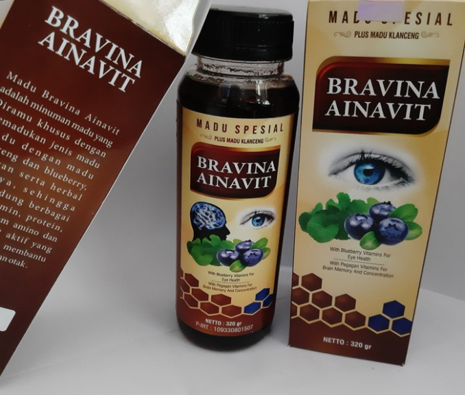 Braniva AinavitMadu Spesial plus Madu KlancengWith Blueberry Vitamins F Eye HealthWith Pegagan Vitamins F Brain Memy and ConcentrationNetto: 320 grP-IRT: 109330801507Produksi: Bravina Herbavit Komposisi:Madu RanduMadu KlancengKulit ManggisBlueberryMengkuduPegaganTakokakKel Madu Bravina Ainavit adalah minuman madu yang diramu khusus sehingga mengandung berbagai multivitamin, protein, mineral, asam amino dan berbagai zat aktif yang penting untuk membantu kesehatan mata dan otak. Aturan minum:Dewasa 2 x 2 sendok makan perhariAnak 2 x 2 sendok teh perhari