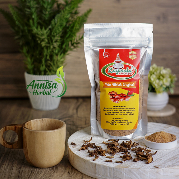 Terbuat dari murni sari Jahe Merah ditambah gula tanpa bahan kimia dan pemanis buatan yang diproses seacara higienis dan berasal dari jahe merah pilihan 1. Meningkatkan Daya Tahan Tubuh 2. Memperlancar Peredaran Darah 3. Mencegah Stroke 4. Melancarkan Haid 5. Meredakan Flu, Batuk, pilek, dan Asma 6. Meredakan Masuk Angin 7. Meningkatkan gairah hubungan suami istri 8. Mengatasi Pegal Linu, Nyeri otot, Badan Meriang, dan Rematik 9. Anti Oksidan 10. Anti Kanker 11. Mencegah Penuaan Dini dan penyakit Degenatif Anjuran Pemakaian: Seduh 2 sendok makan kedalam 200cc air panas atau bisa ditambah es batu bila lebih disukai. Dapat dicampur Susu, Creamer, Kopi, atau Jeruk Lemon MinumanHerbal Imunitas JaheMerah JAREN TanpaGula TanpaPengawet