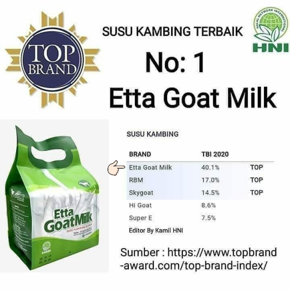 Etta Goat Milk Kadar nutrisi dan khasiat susu kambing amatlah istimewa. Komposisi gizinya baik yang berupa protein, energi, maupun lemak, mendekati komposisi ASI. Susu Kambing Etawa adalah Susu kambing yang memiliki kandungan protein terbaik. Kandungan protein yang terkandung dalam susu kambing etawa hampir dapat disetarakan dengan Air Susu Ibu (ASI) dan lebih baik daripada telur.