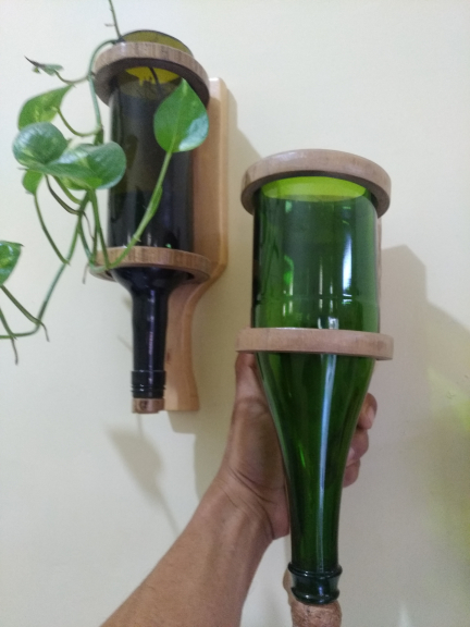 Pot kaca singel dinding hasil pengolahan limbah botol kaca dipadu dengan dudukan dinding terbuat dari kayu jati blanda dan bambu. Waktu pengerjaan maks 5 hari, Open PO