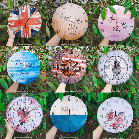 Jam Dinding Kayu Karakter Jam dinding dengan motif kayu ini sangat menarik, design simpel, minimalis namun tetap artistik. Memberikan kesan elegan, sehingga sangat cocok untuk menghiasi ruangan kesayangan anda. - Bahan dasar terbuat dari material papan Kayu Medium Density Fibreboard (MDF) dengan lapisan yang sangat halus dan berkualitas. Dilengkapi dengan anti jamur yang akan membuat material lebih awet dan tahan lama. - Ketebalan material 9mm (tebal dan kuat, berbeda dengan ketebalan dibawah 9mm yang akan membuat material lebih mudah patah dan rapuh pada saat proses pengiriman oleh kurir). - Finishing laminasi anti air, anti debu, anti UV sehingga akan awet dan memudahkan dalam proses perawatan. - Material cetak sticker berkualitas tinggi dengan gambar tidak pecah, ditambah dengan laminasi yang tidak akan luntur (tahan air) dan bisa dibersihkan / di lap jika kot. - Mesin Jam Standard Sweep Movement, sangat akurat, sunyi dan senyap sehingga tidak berisik. Serta dilengkapi dengan gantungan untuk pengait dari besi. - Ukuran Diameter Jam 30cm x 40cm. - Free request design custom dan tulisan sesuai keinginan. - Pilihan warna jarum bisa hitam dan putih. - Gratis bonus 1pcs baterai ukuran AA.