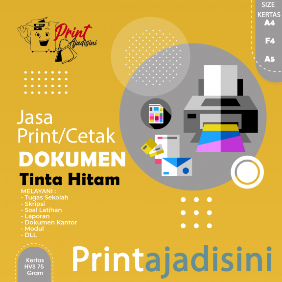 Print/Cetak Dokumen untuk Keperluan: - Tugas Sekolah - Skripsi/Makalah - Soal Latihan - Modul - Dokumen Kant - Lapan - Dll. cetak menggunakan Kertas HVS 75 Gram tinta Hitam File bisa di kirim ke Wa Atau Email