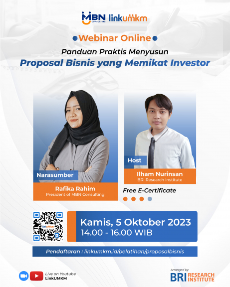LINK UMKM - BRI Research Institute mengadakan webinar online untuk Sobat LinkUMKM Brilian. Webinar Online membahas materi bisnis yang sangat menarik dengan tema “Panduan Praktis Menyusun Proposal Bisnis yang memikat Investor”. Pada hari Kamis, 05 Oktober 2023 telah diadakan webinar online pada zoom meeting dan disiarkan secara Live di kanal youtube LINKUMKM. Webinar online rutin yang diadakan ini khusus untuk pelaku UMKM yang ingin belajar meningkatkan bisnis, terutama untuk menggaet investor bisnis dalam menanamkan modalnya.