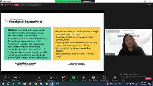 Sesi pemaparan materi oleh Ibu Faby menjadi agenda utama dalam webinar ini. Ibu Faby memulai dengan menekankan pentingnya memahami segmen pasar di Indonesia. Perbedaan segmen pasar membutuhkan strategi pemasaran yang berbeda. Ibu Faby juga menjelaskan pengaruh teknologi dan internet yang membuka peluang baru bagi UMKM.