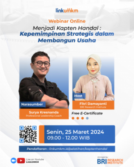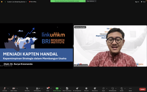 Bertujuan untuk mengatasi tantangan tersebut, pada Senin, 25 Maret 2024, BRI Research Institute menyelenggarakan webinar online yang bertajuk "Menjadi Kapten Handal: Kepemimpinan Strategis Dalam Membangun Usaha." Acara ini dihadiri oleh lebih dari 40 peserta dari seluruh Indonesia, yang semuanya bersemangat untuk memperoleh wawasan tentang strategi kepemimpinan yang efektif dalam mengelola bisnis mereka. Narasumber utama acara ini adalah Bapak Surya, seorang Professional Leadership Coach.