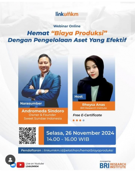 Webinar yang digelar secara online ini menghadirkan Andromeda Sindoro, Owner & Founder Sweet Sundae Indonesia, sebagai narasumber utama. Andromeda, yang dikenal sebagai pengusaha sukses di bidang kuliner, memaparkan berbagai strategi praktis dalam pengelolaan aset untuk mengurangi biaya produksi tanpa mengorbankan kualitas produk. Dalam sesi yang berlangsung penuh antusiasme, Andromeda menekankan bahwa pengelolaan aset yang efektif dapat menjadi kunci untuk mengoptimalkan penggunaan sumber daya yang ada, baik itu berupa peralatan, bahan baku, atau aset digital, untuk meningkatkan efisiensi dan mengurangi pemborosan.