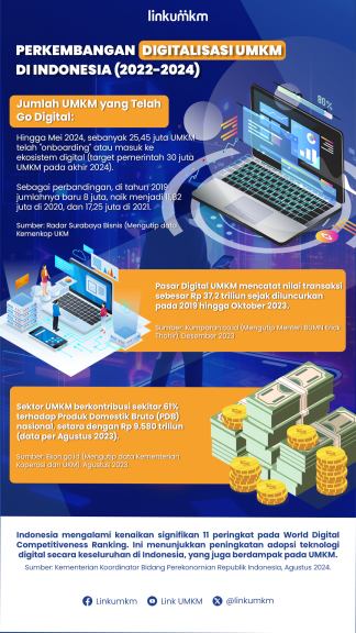 Perjalanan digitalisasi ini mengalami peningkatan pesat dibanding tahun-tahun sebelumnya. Pada 2019, jumlah UMKM digital baru mencapai 8 juta unit, kemudian meningkat menjadi 11,82 juta pada 2020 dan 17,25 juta di 2021. Tren ini menunjukkan respons positif dari pelaku usaha terhadap tuntutan pasar digital yang semakin berkembang.