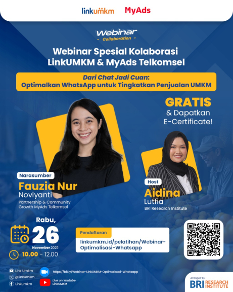 LINK UMKM - LinkUMKM bersama MyAds Telkomsel menggelar Webinar Spesial bertema “Dari Chat Jadi Cuan: Optimalkan WhatsApp untuk Tingkatkan Penjualan UMKM” sebagai upaya memperkuat kemampuan digital pelaku usaha. Kegiatan ini menghadirkan Fauzia Nur Noviyanti, Partnership & Community Growth MyAds Telkomsel, sebagai narasumber, dengan Aidina Lutfia dari BRI Research Institute sebagai host.