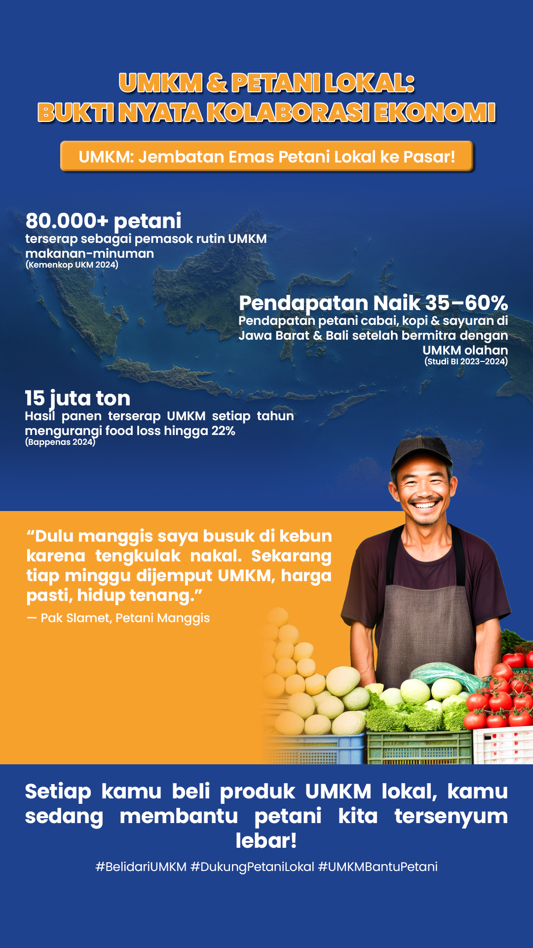 LINK UMKM - Kolaborasi antara UMKM dan petani lokal semakin terlihat sebagai penggerak ekonomi nyata di tingkat daerah. Data 2024 menunjukkan lebih dari 80.000 petani terserap sebagai pemasok rutin bagi pelaku usaha makanan dan minuman, menandakan bahwa rantai pasok produk segar kini semakin terintegrasi dengan sektor pengolahan. Pola kemitraan ini meminimalkan ketergantungan pada tengkulak sekaligus membuka akses pasar yang lebih stabil bagi petani.