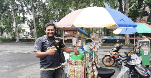 Andik Eko Prasetyo tetap semangat jualan kopi keliling di Kelapa Gading meski hujan dan tren kopi kekinian, berbagi lokasi usaha dengan mertuanya.
