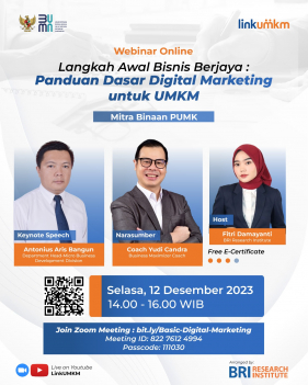 Webinar online berlangsung pada hari Selasa, 12 Desember 2023 melalui zoom meeting dan siaran langsung di youtube LINKUMKM.
