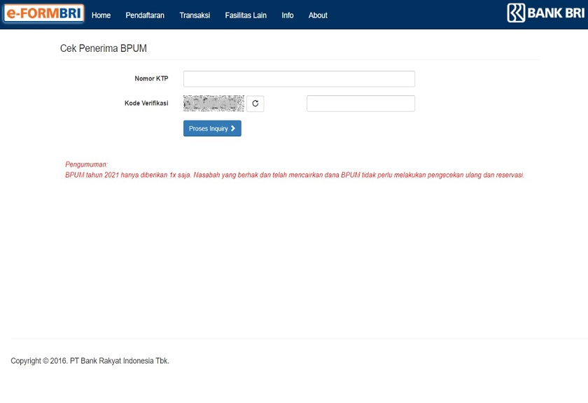 Melalui e-form online ini, nasabah atau penerima BPUM sebesar Rp 1,2 juta, bisa melakukan pengecekan sekaligus reservasi online untuk memilih jadwal antrean sehingga nasabah bisa langsung dilayani di Unit Kerja Operasi (UKO) sesuai jadwal yang telah dipilih.