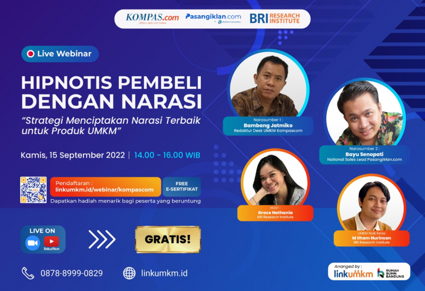 LINK UMKM - Mengggandeng Kompas.com dan Pasangiklan.com Linkumkm mengadakan webinar bertemakan “Hipnotis Pembeli dengan Narasi”, yang diadakan pada 15 September. Selain menggandeng Kompas.com, Linkumkm menghadirkan narasumber dari Pasangiklan.com, yaitu bapak Bayu A. Senopati. Webinar dimulai dengan sesi foto bersama peserta webinar, nantinya dari sesi foto ini akan dipilih satu peserta beruntung dengan pose terunik yang berhak mendapatkan hadiah berupa saldo LinkAja. Setelah sessi foto bersama webinar dilanjutkan dengan pemaparan materi oleh bapak Bambang Jatmiko selaku narasumber sekaligus redaktur Kompas.com. Materi yang dibawakan oleh bapak bambang Jatmiko dikemas dengan judul “Membangun Narasi Pada Produk”, di awal pemaparannya bapak bambang Jatmiko menjelaskan narasi sebagai unsur pembeda suatu produk dari produk-produk lainnya.