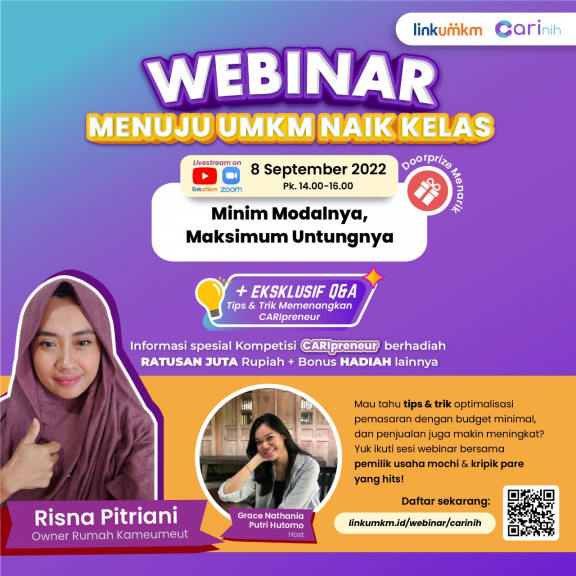 LINK UMKM - Sesi webinar dalam rangka Semarak UMKM Naik Kelas bersama mitra UMKM di seluruh Indonesia. Webinar yang berlangsung pada 8 September 2022 mengankat tema “Minim Modalnya, Maksimum Untungnya”diahdiri kurang lebih 100 pelaku UMKM yang meraikan ruang Zoom dan livestream di kanal resmi YouTube Linkumkm. Webinar diawali dengan sesi foto bersama sekaligus challange foto terunik yang diikuti oleh sahabat linkumkm yang ada di room Zoom. Nantinya akan ada satu pemenang dengan foto terunik yang berhak mendapat hadiah berupa saldo LinkAja. Setelah sesi foto bersama, wabinar dilanjutkan dengan pemaparan materi yang dibawakan oleh ibu Risna Pitriani, owner dari “Rumah Kameumeut”.