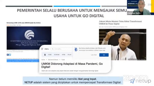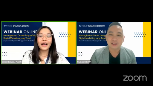Kebutuhan terhadap platform bisnis online membuat Netup hadir sebagai salah satu penyedia jasa website yang siap membantu para pelaku umkm dalam mempersiapkan website bisnisnya. Kehadiran website bisnis akan menambah kesan profesional dan tidak hanya itu saja tetapi juga bisa menaikkan tingkat kepercayaan pelanggan terhadap bisnis yang dikelola. Oleh karena itu Netup menawaran jasa pembuatan website yang dapat dengan mudah dimanfaatkan oleh para pelaku umkm dalam membangun website bisnis masing-masing. Setelah sesi pemaparan materi oleh pak Christian, webinar dilanjutkan dengan sesi pemapran materi oleh tim Linkumkm yang membahas mengai platform Linkumkm beserta fitur-fitur yang tersedia di dalamnya. Webinar diakhiri dengan kuis berhadiah yang diikuti oleh para peserta webinar, nantinya akan ada dua pemenang dari kuis ini ditambah satu lagi pemenang dari kontes foto terunik yang berhak memenangkan hadiah berupa saldo LinkAja. webinar pun ditutup setelah nama-nama pemenang diumumkan oleh tim Linkumkm.