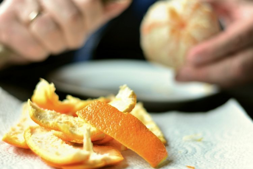 - Pertama bersihkan kulit jeruk dengan air putih.