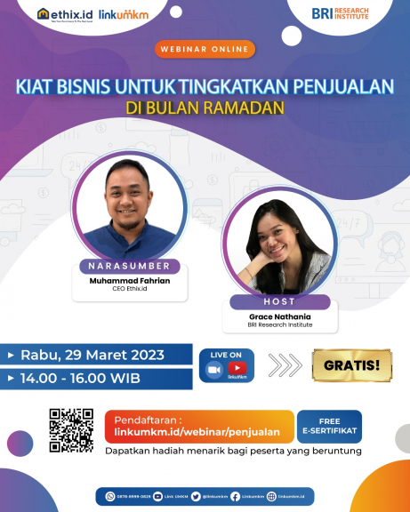 LINK UMKM - Webinar terbaru dari BRI Research Institute yang menghadirkan CEO Ethix.id sebagai narasumber yang akan membahas materi dengan tema luas “Kiat Bisnis Untuk Tingkatkan Penjualan di Bulan Ramadhan”. Webinar rutin BRI Research Institute ditujukan bagi para pelaku UMKM yang ingin meningkatkan penjualannya di bulan ramadhan.