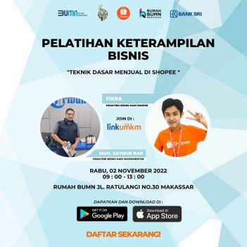 Rumah BUMN Makassar Berkolaborasi dengan Shopee dan mikromentor chapter makassar akan melangsungkan kegiatan Pelatihan dengan tema "TEKNIK DASAR MENJUAL DI SHOPEE" Diharapkan output pelatihan ini akan meningkatkan skill/keterampilan agar dapat membantu meningkatkan kesejahteraan rumah tangga.
