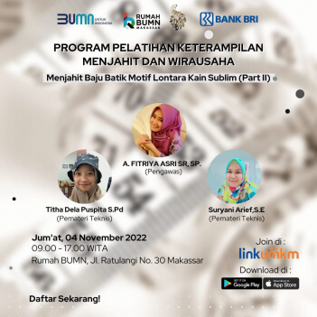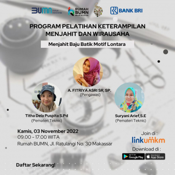 Rumah BUMN Makassar Berkolaborasi dengan Komunitas Dress Maker dan mikromentor chapter makassar akan melangsungkan kegiatan Pelatihan dengan tema "WORKSHOP MENJAHIT BAJU BATIK MOTIF LONTARA KAIN SUBLIM" Diharapkan output pelatihan ini akan meningkatkan skill/keterampilan agar dapat membantu meningkatkan kesejahteraan rumah tangga.