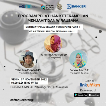 Rumah BUMN Makassar Berkolaborasi dengan Komunitas Dress Maker dan mikromentor chapter makassar akan melangsungkan kegiatan Pelatihan dengan tema "MEMBUAT POLA CELANA PEREMPUAN PART 2 (KELAS LANJUTAN PKW 08,09,10 & 11)" Diharapkan output pelatihan ini akan meningkatkan skill/keterampilan agar dapat membantu meningkatkan kesejahteraan rumah tangga.