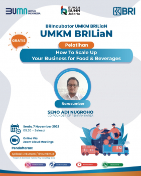 Pelatihan dengan tema how to scale up your business for food & beverages. Yuk ikuti kegiatan besok untuk kamu yang memiliki bisnis makanan & minuman.