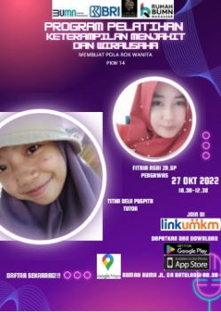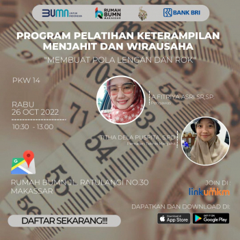 Rumah BUMN Makassar Berkolaborasi dengan Komunitas Dress Maker dan mikromentor chapter makassar akan melangsungkan kegiatan Pelatihan dengan tema "Membuat Pola Lengan dan Rok (Kelas Bisnis dan Teknis PKW 14)". Diharapkan output pelatihan ini akan meningkatkan skill/keterampilan agar dapat membantu meningkatkan kesejahteraan rumah tangga.