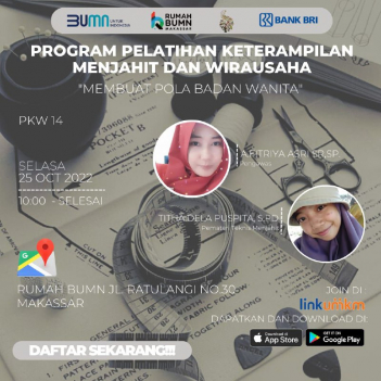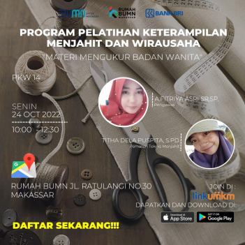 Rumah BUMN Makassar Berkolaborasi dengan Komunitas Dress Maker dan mikromentor chapter makassar akan melangsungkan kegiatan Pelatihan dengan tema "MEMBUAT POLA BADAN WANITA (KELAS TEKNIS PKW 14)". Diharapkan output pelatihan ini akan meningkatkan skill/keterampilan agar dapat membantu meningkatkan kesejahteraan rumah tangga.