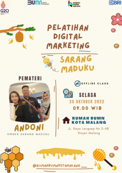 PELATIHAN DIGITAL MARKETING UNTUK PRODUK MADU OLEH OWNER SARANG MADUKU, YANG DIADAKAN PADA :