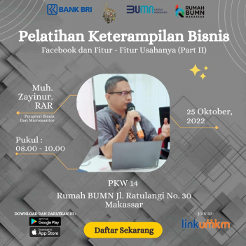 Rumah BUMN Makassar Berkolaborasi dengan Komunitas Dress Maker dan mikromentor chapter makassar akan melangsungkan kegiatan Pelatihan dengan tema "FACEBOOK DAN FITUR-FITUR USAHANYA PART 2 (KELAS BISNIS PKW 14)". Diharapkan output pelatihan ini akan meningkatkan skill/keterampilan agar dapat membantu meningkatkan kesejahteraan rumah tangga.