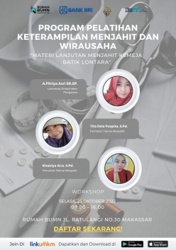 Rumah BUMN Makassar Berkolaborasi dengan Komunitas Dress Maker dan mikromentor chapter makassar akan melangsungkan kegiatan Pelatihan dengan tema "WORKSHOP MENJAHIT KEMEJA BATIK LONTARA (KELAS LANJUTAN GABUNGAN)". Diharapkan output pelatihan ini akan meningkatkan skill/keterampilan agar dapat membantu meningkatkan kesejahteraan rumah tangga.