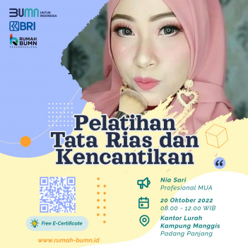 Rumah BUMN Padang Panjang mengadakan Pelatihan "PELATIHAN TATARIAS & KECANTIKAN". Menghadirkan pakar dibidangnya demi kemajuan UMKM Indonesia.