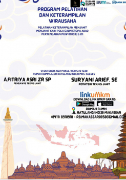 Rumah BUMN Makassar Berkolaborasi dengan Komunitas Dress Maker dan mikromentor chapter makassar akan melangsungkan kegiatan Pelatihan dengan tema "MENJAHIT KAIN POLA GAUN EROPA ABAD PERTENGAHAN (KELAS TEKNIS PKW 1, 2, 3 DAN 4)". Diharapkan output pelatihan ini akan meningkatkan skill/keterampilan agar dapat membantu meningkatkan kesejahteraan rumah tangga.