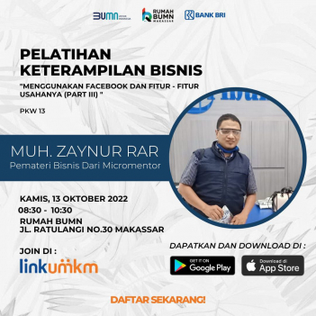 Rumah BUMN Makassar Berkolaborasi dengan Komunitas Dress Maker dan mikromentor chapter makassar akan melangsungkan kegiatan Pelatihan dengan tema "MENGGUNAKAN FACEBOOK DAN FITUR-FITUR USAHA PART 3 (KELAS PKW 13)". Diharapkan output pelatihan ini akan meningkatkan skill/keterampilan agar dapat membantu meningkatkan kesejahteraan rumah tangga.