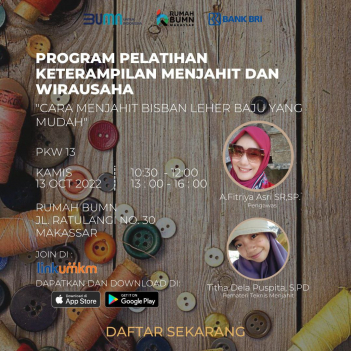 Rumah BUMN Makassar Berkolaborasi dengan Komunitas Dress Maker dan mikromentor chapter makassar akan melangsungkan kegiatan Pelatihan dengan tema "CARA MENJAHIT BISBAN LEHER BAJU YANG MUDAH (KELAS TEKNIS PKW 13)". Diharapkan output pelatihan ini akan meningkatkan skill/keterampilan agar dapat membantu meningkatkan kesejahteraan rumah tangga.