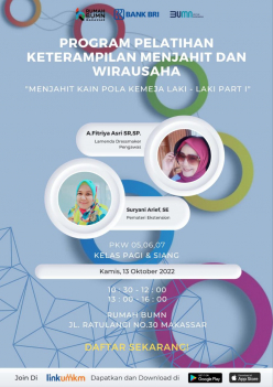 Rumah BUMN Makassar Berkolaborasi dengan Komunitas Dress Maker dan mikromentor chapter makassar akan melangsungkan kegiatan Pelatihan dengan tema "MENJAHIT KAIN GUNTINGAN POLA ATASAN (KELAS TEKNIS PKW 13)". Diharapkan output pelatihan ini akan meningkatkan skill/keterampilan agar dapat membantu meningkatkan kesejahteraan rumah tangga.