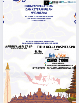 Rumah BUMN Makassar Berkolaborasi dengan Komunitas Dress Maker dan mikromentor chapter makassar akan melangsungkan kegiatan Pelatihan bisnis dan wirausaha dengan tema "FACEBOOK, MARKETPALCE DAN GROUP DAGANG (KELAS BISNIS LANJUTAN PKW 8, 9 10 DAN 11" Diharapkan output pelatihan ini akan meningkatkan skill/keterampilan agar dapat membantu meningkatkan kesejahteraan rumah tangga.