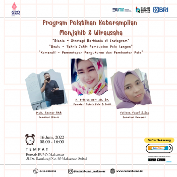 Rumah BUMN Makassar Berkolaborasi dengan Komunitas Jarum Benang akan melangsungkan kegiatan Pelatihan Klaster Fhasion “Gabungan - Menjahit Hiasan Mukenah dan Tas Mukenah”. Diharapkan output pelatihan ini akan meningkatkan skill/keterampilan agar dapat membantu meningkatkan kesejahteraan rumah tangga.