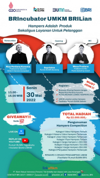 Rumah BUMN BRI mempersembahkan BRIncubator UMKM BRILian | PENGUMUMAN HAMPERS COMPETITION yang diawali dengan TALKSHOW BERTEMA HAMPERS ADALAH PRODUK SEKALIGUS LAYANAN UNTUK PELANGGAN, yang akan dilaksanakan pada: