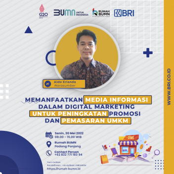 Rumah BUMN Padang Panjang mengadakan Pelatihan "MEMANFAATKAN MEDIA INFORMASI DALAM DIGITAL MARKETING UNTUK PENINGKATAN PROMOSI DAN PEMASARAN UMKM". Menghadirkan pakar dibidangnya demi kemajuan UMKM Indonesia.