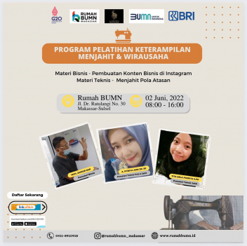 Rumah BUMN Makassar Berkolaborasi dengan Komunitas Jarum Benang akan melangsungkan kegiatan Pelatihan Klaster Fashion “Materi Teknis Menjahit Pola Atasan”. Diharapkan output pelatihan ini akan meningkatkan skill/keterampilan agar dapat membantu meningkatkan kesejahteraan rumah tangga.