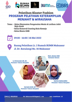 Rumah BUMN Makassar Berkolaborasi dengan Komunitas Jarum Benang akan melangsungkan kegiatan Pelatihan Klaster Fashion “Program Pelatihan Keterampilan Jahit Menjahit & Wirausaha Lanjutan Batch 04”. Diharapkan output pelatihan ini akan meningkatkan skill/keterampilan agar dapat membantu meningkatkan kesejahteraan rumah tangga.