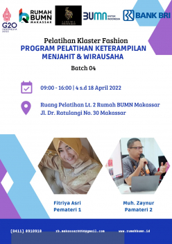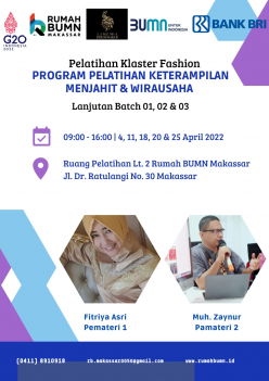 Rumah BUMN Makassar Berkolaborasi dengan Komunitas Jarum Benang akan melangsungkan kegiatan Pelatihan Klaster Fashion “Program Pelatihan Keterampilan Jahit Menjahit & Wirausaha Lanjutan Batch 01, 02 & 03”. Diharapkan output pelatihan ini akan meningkatkan skill/keterampilan agar dapat membantu meningkatkan kesejahteraan rumah tangga.