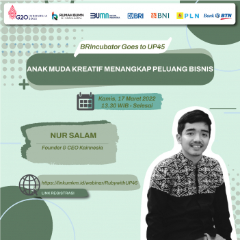 Nah kali ini RuBY x UP45 Akan Menyelenggarakan Pelatihan Online mengenai " BRIncubator Goes To Campus : Anak Muda Kreatif Menangkap Peluang Bisnis " yang akan langsung di jelaskan oleh Kakak Nur Salam - Founder & CEO Kainnesia...