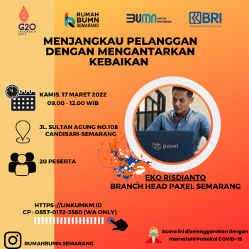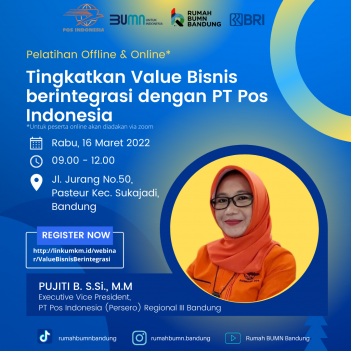 Ikuti pelatihan di Rumah BUMN Bandung yuk bersama PT Pos Indonesia dengan tema “Tingkatkan Value Bisnis Berintegrasi dengan PT Pos Indonesia”. Materi ini akan membahas mengenai Oranger Toko yang merupakan mitra Pos Indonesia yang bertugas untuk memasarkan produk Pos Indonesia dan melakukan layanan penjemputan barang (pick up service) di masing-masing area.