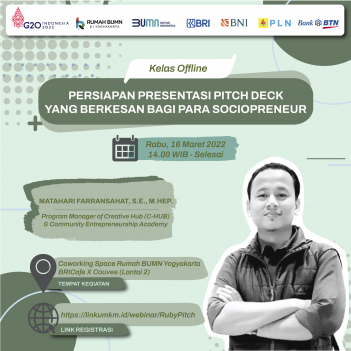 Nah kali ini RuBY Akan Menyelenggarakan Pelatihan Offline mengenai " Persiapan Presentasi Pitch Deck yang Berkesan Bagi Para Sociopreneurship " yang akan langsung di bersamai langsung oleh Kakak Matahari Farransahat., S.E., M.Hep - Program Manager of Creative hub (C-Hub) & Community Entrepreneurship Academy
